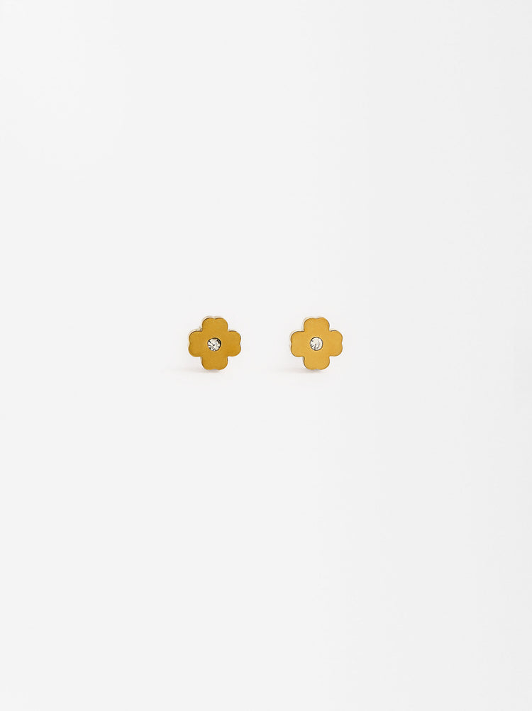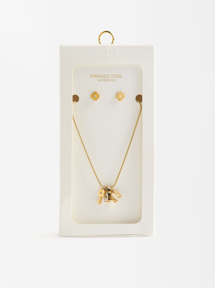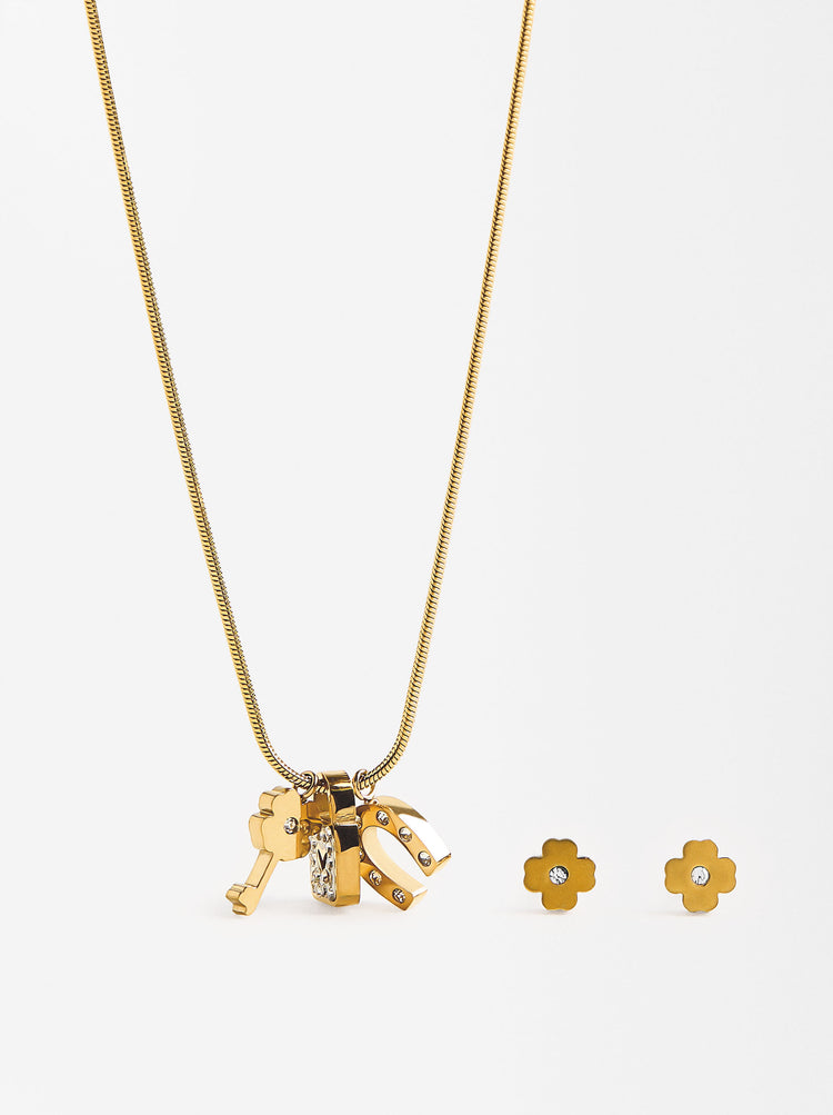 Set Necklace And Earrings With Crystal Charms - Stainless Steel