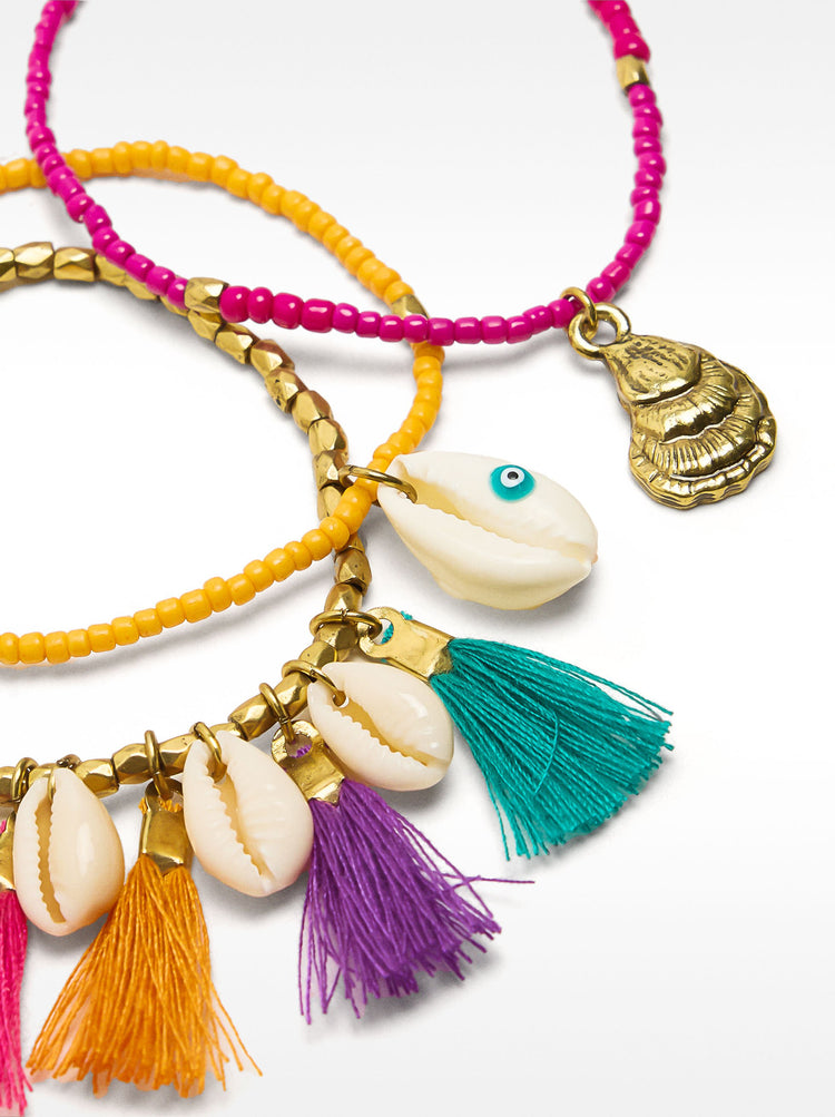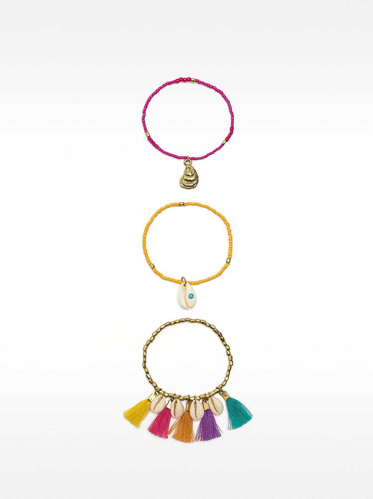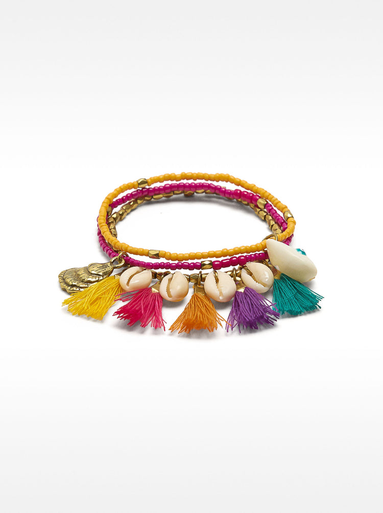 Set Of Elastic Bracelets With Multicolor Tassels